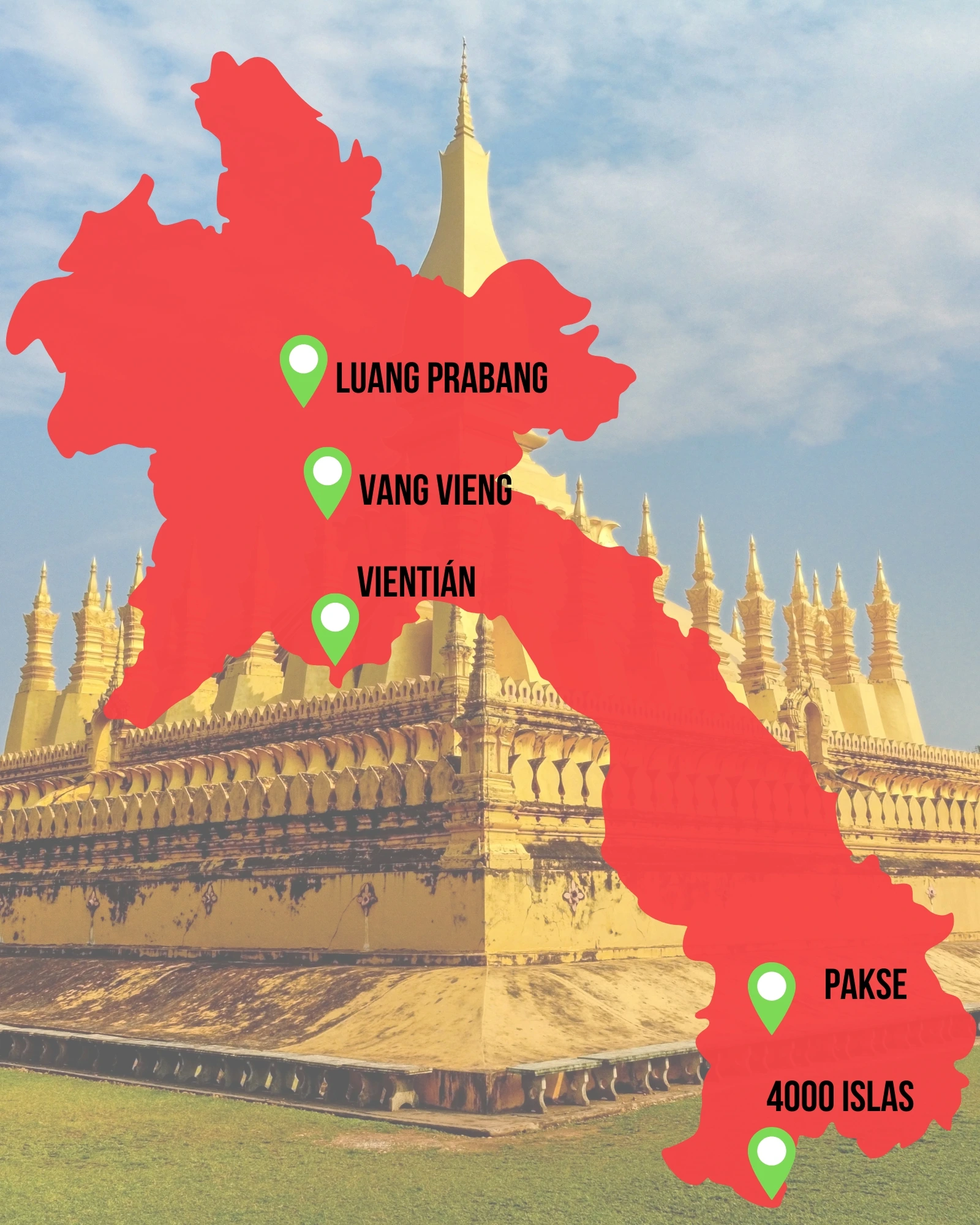 - Vientián: La capital de Laos es pequeñita y en un día completo la podrás ver sin problema. Destaca sin duda por el impresionante templo Pha That Luang, símbolo del país que aparece incluso en sus billetes.