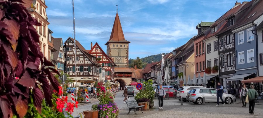 Es el lugar en el que hacer LA FOTO de Colonia con las casas de colores y la torre de la Iglesia de San Martín al fondo, una iglesia benedictina que también es posible visitar por dentro.