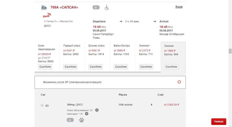 - Una vez le deis a Buy ticket, os aparecerán todas las opciones para el día que habéis elegido. Allí veréis las horas de salida y muy importante, el tiempo del trayecto. Si queréis viajar en tren de alta velocidad, tenéis que buscar la opción «САПСАН», en ruso. Una vez encontrado, veréis que hay diferentes precios en función de la clase. La más barata es la última, la «economy class»
