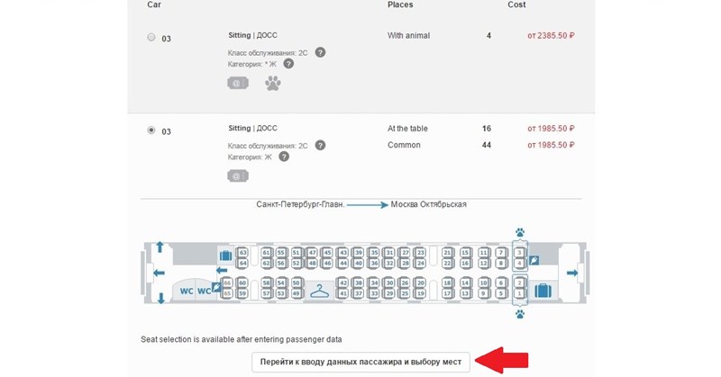 4. Elegir asiento. Cuando seleccionéis la tarifa con la que queréis viajar, llega la hora de elegir asiento. Se os desglosarán varias opciones. Básicamente, tendréis que elegir entre «with animal» (en caso de que viajéis con mascotas) o «at a table/common». Seguramente escogeréis esta última y una vez hecho hay que darle al botón que encontraréis más abajo que en inglés pone «Go to passenger data entry and seat selection».