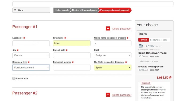 5. Rellenar los datos de los pasajeros. Aquí os pedirá que rellenéis los datos de los pasajeros y seleccionéis asiento en el tren.